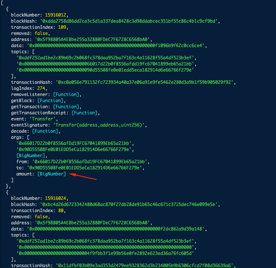 If you see the event array, congrats! you have mastered yet another skill! You may notice the red arrow pointing at the amount. The amount is a bignumber object, and therefore not displayed properly in the console. We will later learn how to parse and filter that amount. That will form the basis of tracking whales in later chapters.