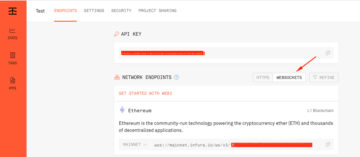 First, we will need a Websocket provider. We do so by using ethers.providers.WebSocketProvider and passing in infura websocket gateway , which you can get from infura by clicking the "websocket" tab in API keys section: