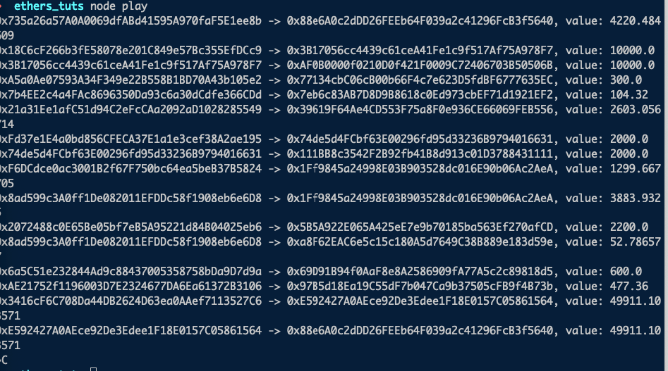 main()In above code, we get the current block using const block = await provider.getBlockNumber() and then look for all the transfer events in the last blocks with const transferEvents = await contract.queryFilter('Transfer', block - 10, block)