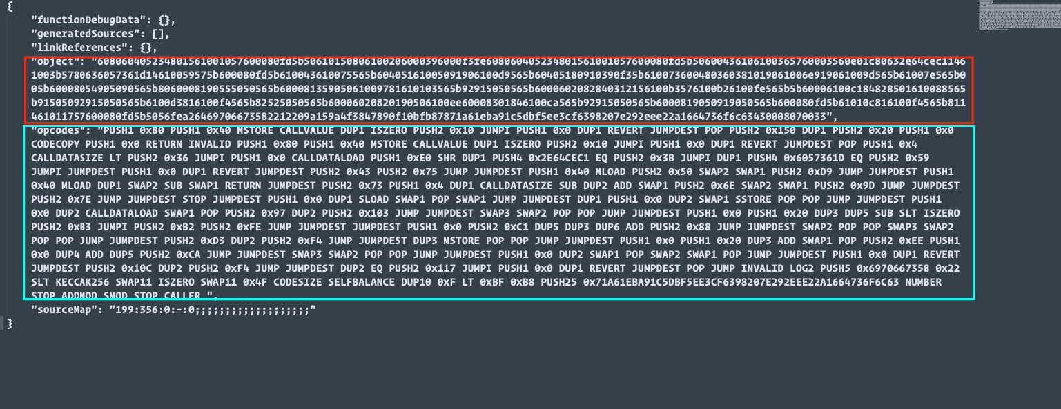 The "object" key (red block in the diagram above) holds the bytecode, while the "opcodes" key (the the cyan block) holds the opcode.