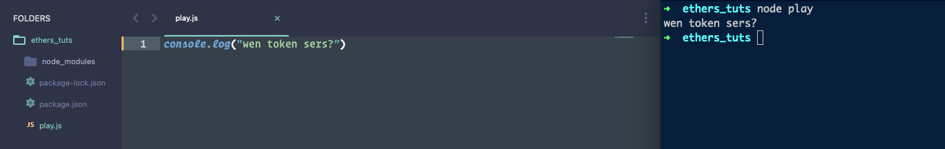 console.log("wen token sers?")We can run the following command in our console to run the script in play.js ( which is just one line of code for now)